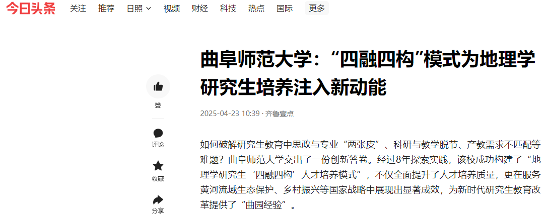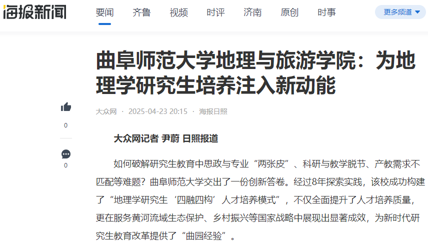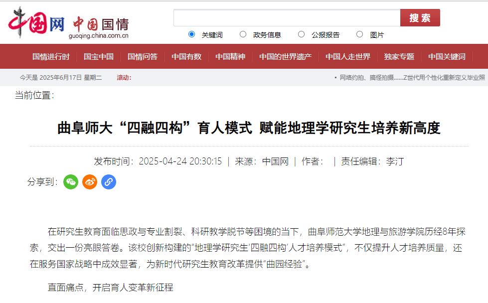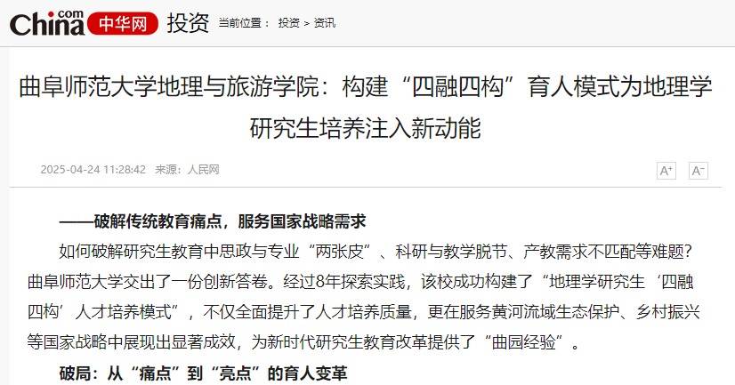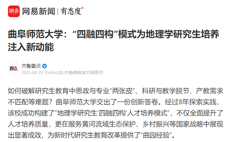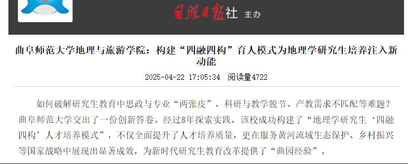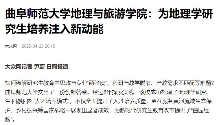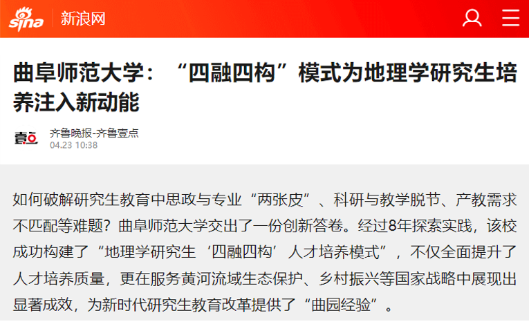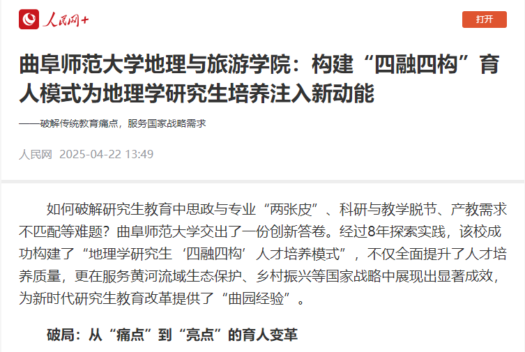为了破解研究生教育中思政与专业“两张皮”、科研与教学脱节、产教需求不匹配等难题,学院经过多年探索实践,构建了“地理学研究生‘四融四构’人才培养模式”。该模式通过多维协同机制实现了课程思政与专业教学、科学研究与教学产能、产教融合与社会需求、外部促进与内部激励的有机融合。人民网指出,“四融四构”人才培养模式不仅全面提升了人才培养质量,更在服务黄河流域生态保护、乡村振兴等国家战略中展现出显著成效,为新时代研究生教育改革提供了“曲园经验”。