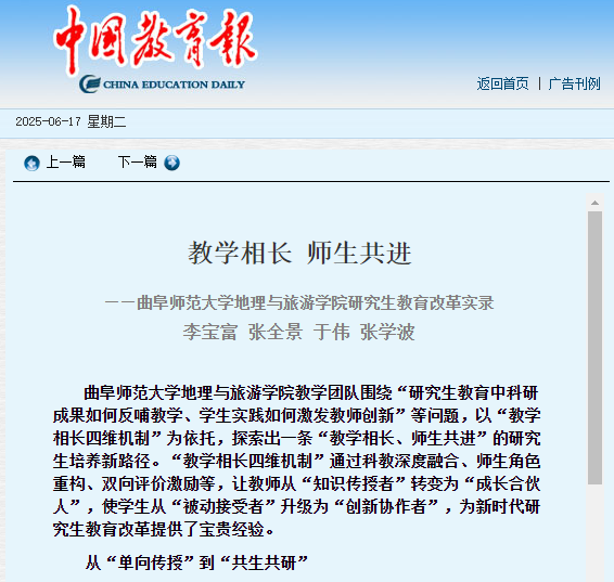 研究生教学中得到了充分实践、广泛应用,同时促进了导师队伍水平的提升。中国教育报指出,这种“教学相长、师生共进”的研究生培养新路径,促进了地理学及相关学科的发展,成为新时代研究生教育改革的优秀实践。